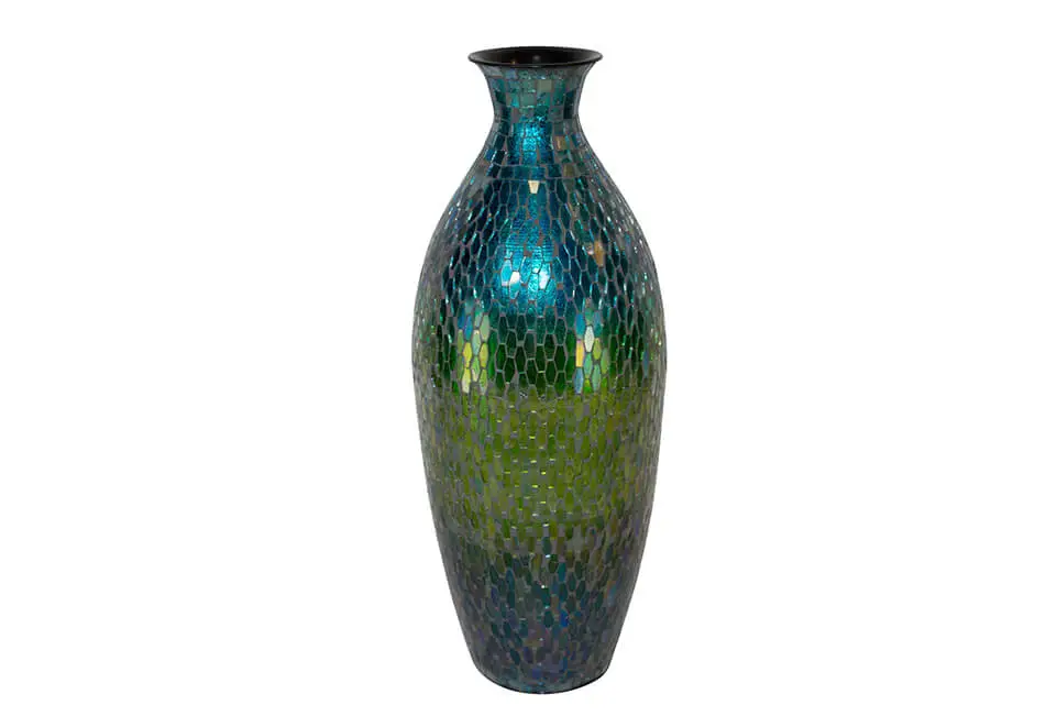 This Glass Vase with Green & Teal Mosaic Design is a vibrant and colorful addition to your wedding venue. It's perfect for adding a touch of fun and elegance to your decor.