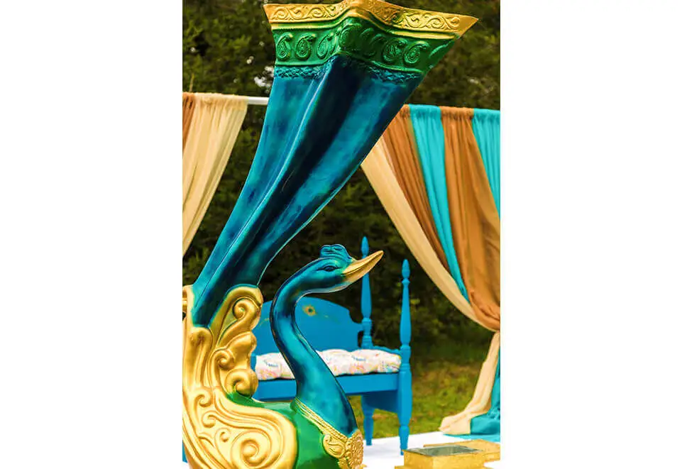 Our Hand Painted Fiberglass Peacock with Blue & Gold Detailing is a stunning and colorful addition to your wedding decor. It's perfect for adding a touch of elegance and vibrant color to your venue.