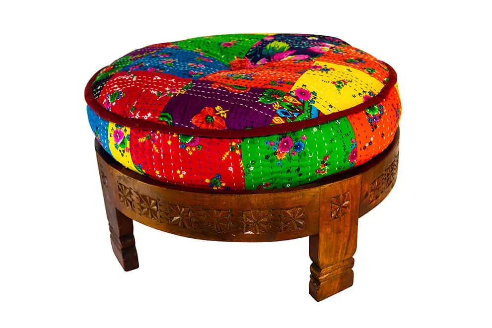 Add a burst of color to your celebration with our Low Round Multicolored Cushioned Stool. It features a quilted floral pattern on a round wooden base, perfect for adding vibrant seating or a decorative touch to your wedding decor.