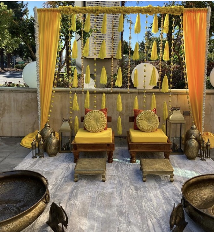 We have low wooden chairs with yellow cushions to match your next event design. These chairs work perfect for a Haldi event or work great on the Mandap!