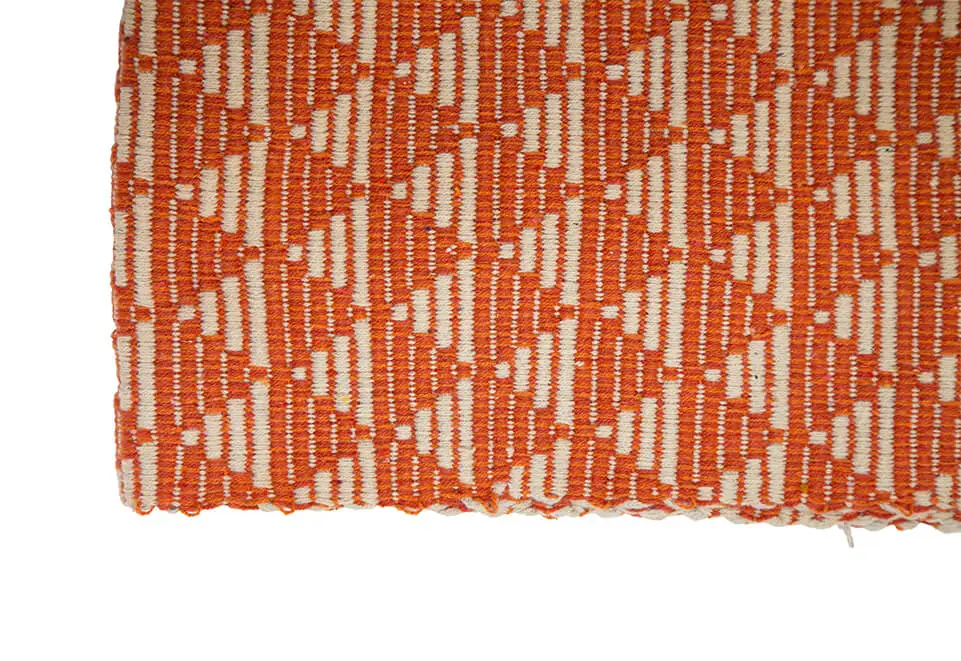 Rectangular carpet with orange & white triangle pattern.