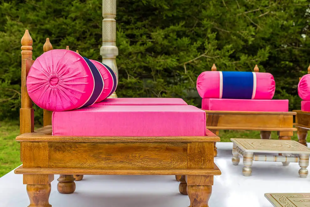 Our Pink Low Wooden Stool with its square bright pink cushion and durable wooden frame offers a charming seating option for your special day. Perfect for adding a splash of color to your wedding decor, this stool is both functional and decorative.