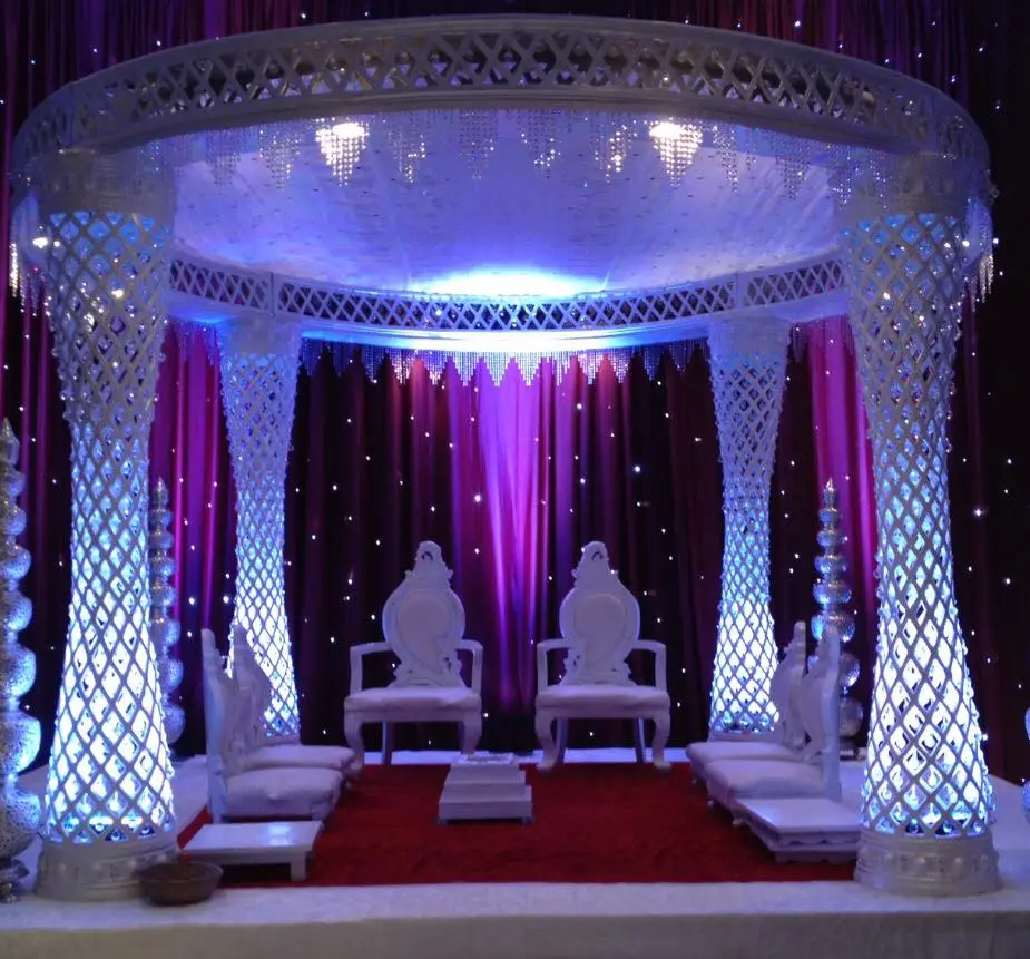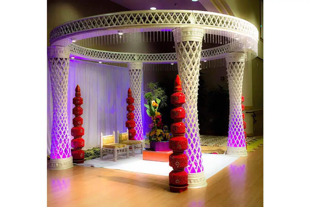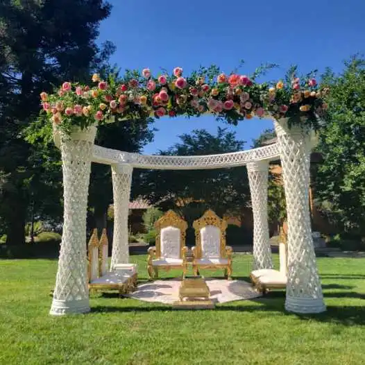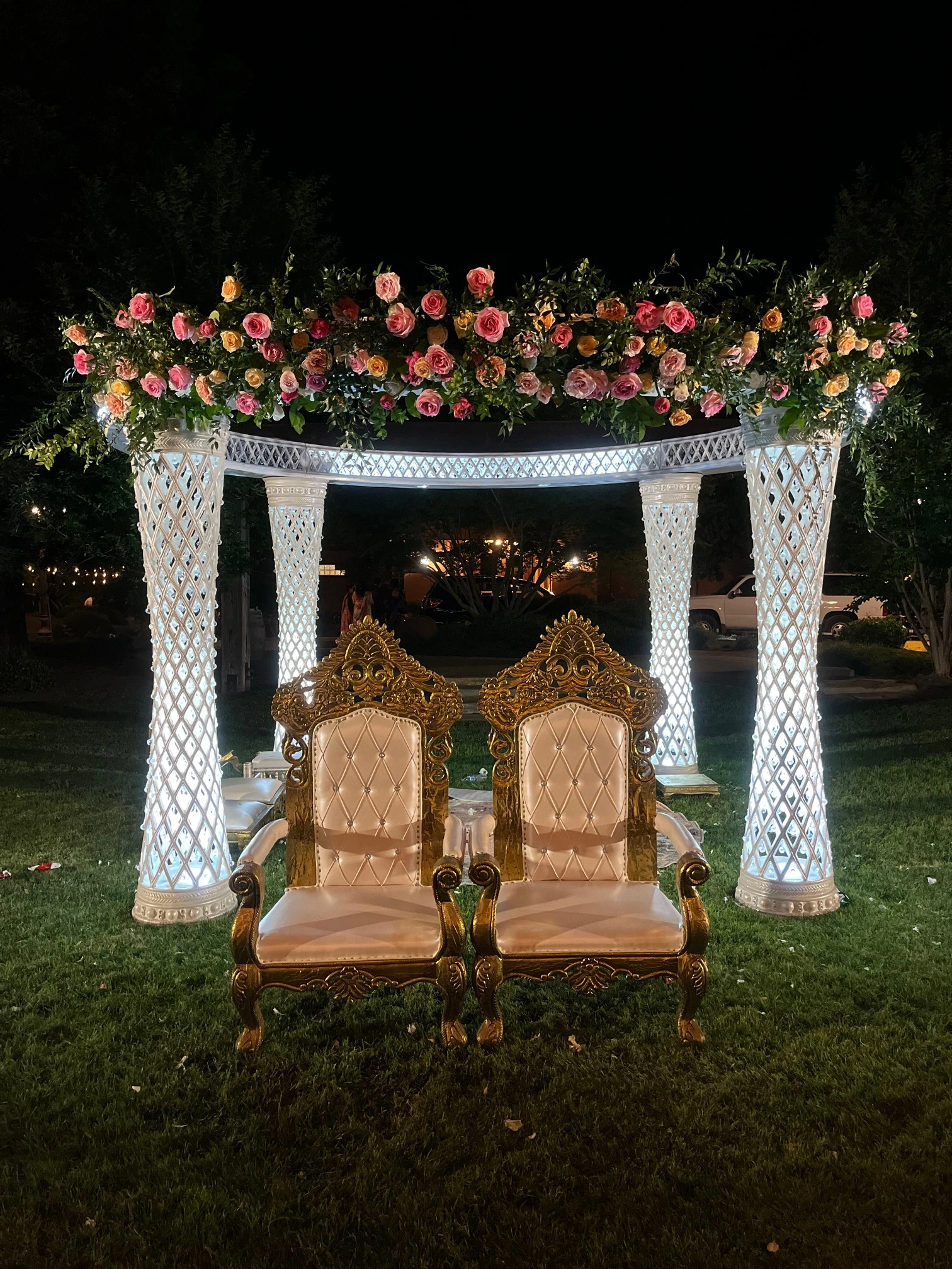 Elevate your event with our stunning Round White Mandap, a beautiful and versatile structure perfect for ceremonies. It comes with an optional matching entrance, ideal for creating a grand entrance for your guests. Add uplights and decor accents to create a magical night-time Mandap. Reach out today to customize this piece for your special day!