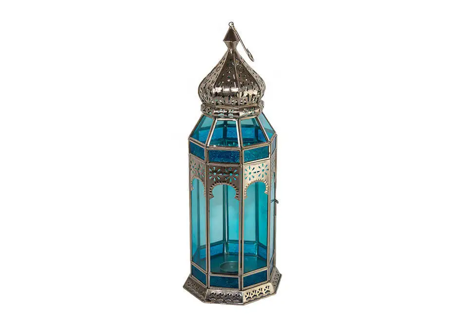 This Polished Silver Colored Lantern with Light & Dark Blue Jewels is a stylish and colorful lighting option for your wedding. It adds a touch of luxury and sophistication to your venue.