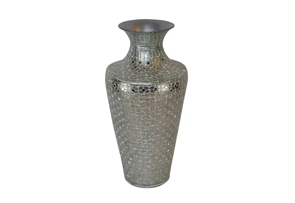 Our Glass Vase with White & Silver Mosaic Design is a stylish and unique addition to your wedding decor. It's perfect for adding a touch of elegance and vibrant color to your venue.